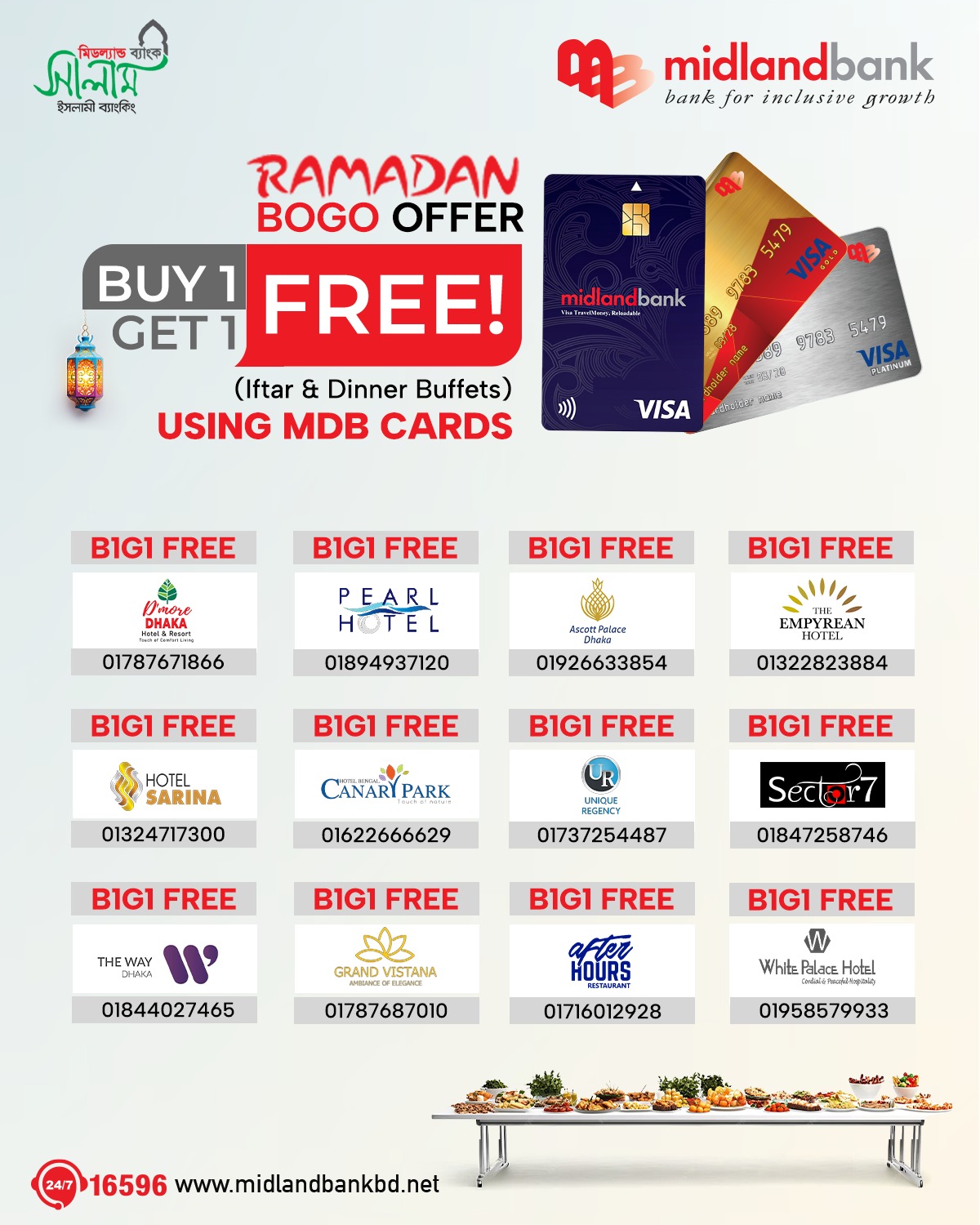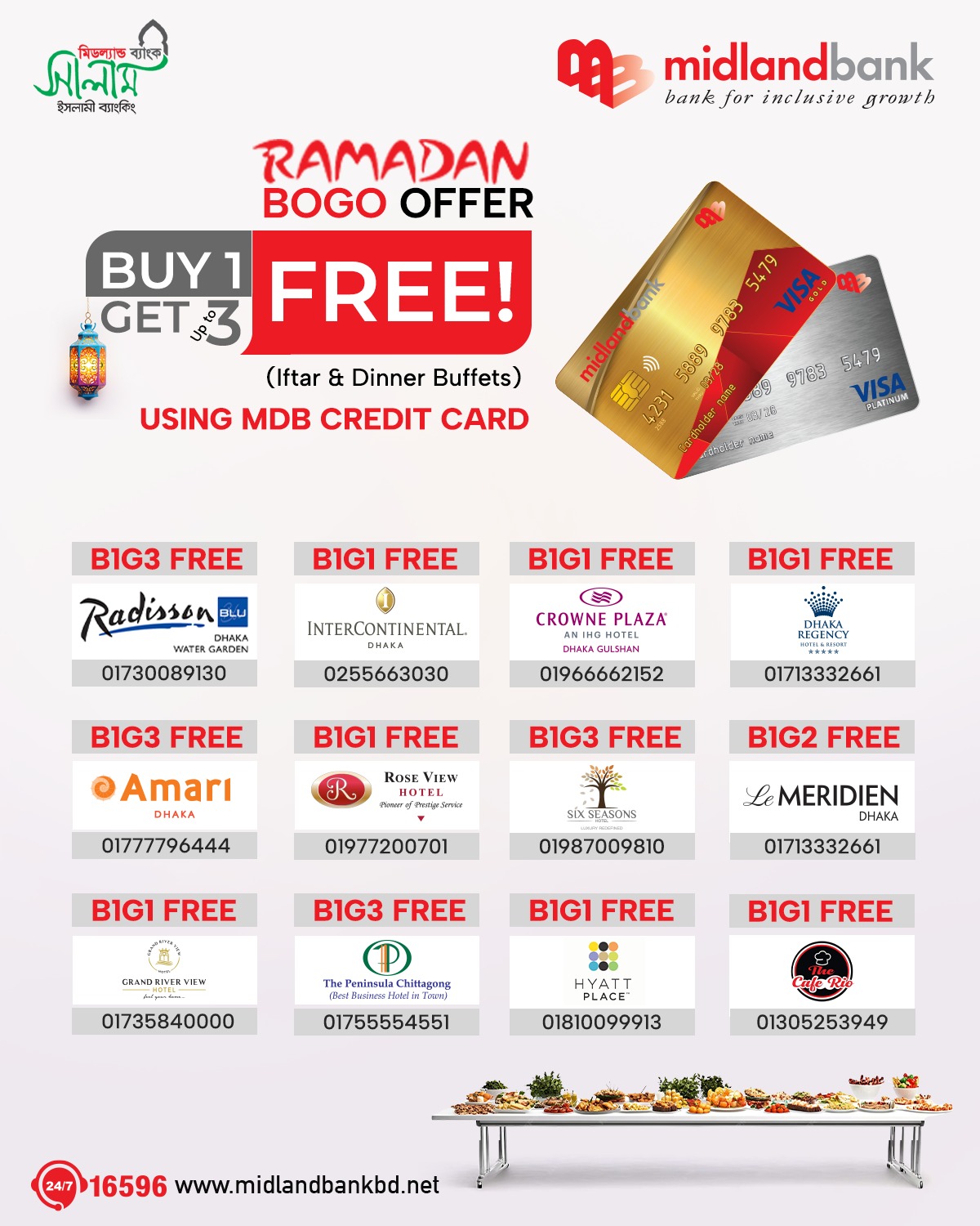 | Dhaka Regency | Grandiose | Buy 1 Get 1 Free (Buffet Lunch / Dinner/ Iftar) | Airport Road, Nikunja 2, Dhaka- 1229 | Round the year | MDB Credit Cards | +8801713332661 |