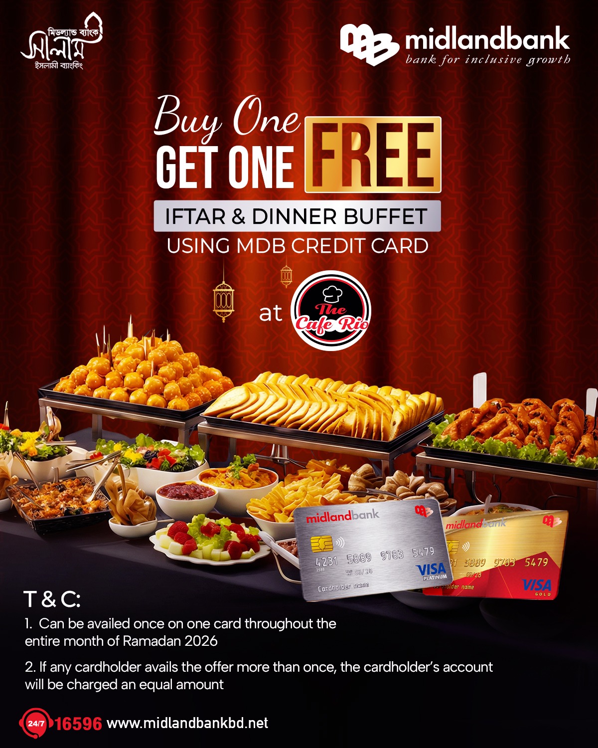 | The Café Rio | Restaurant | DISCOUNT / OFFER DETAILS Buy 1 Get 1 Free (Buffet Breakfast/ Brunch/ Dinner/ Lunch/ Iftar) | Dhanmondi , Gulshan & Uttara Outlet | Round the year | MDB Credit Cards | +8801305253949 +8801799437172 +8801771657558 |